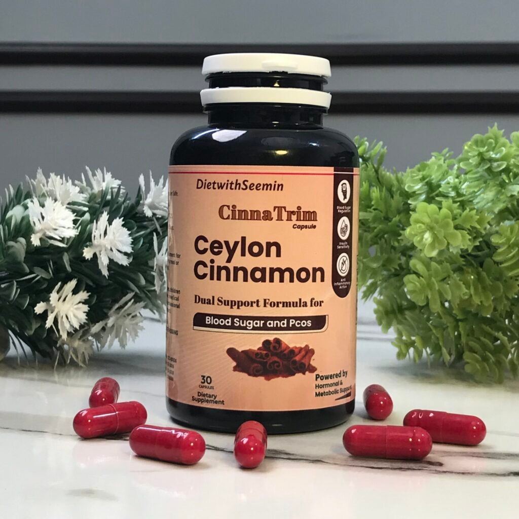 CinnaTrim Ceylon Cinnamon Capsules by DietwithSeemin are a premium dietary supplement formulated to support healthy blood sugar levels and hormonal balance. Made with high-quality Ceylon cinnamon, along with Chromium picolinate , an important mineral for controlling blood sugar levels and providing satiety, this formula is designed especially for individuals managing blood sugar fluctuations and PCOS-related concerns.
